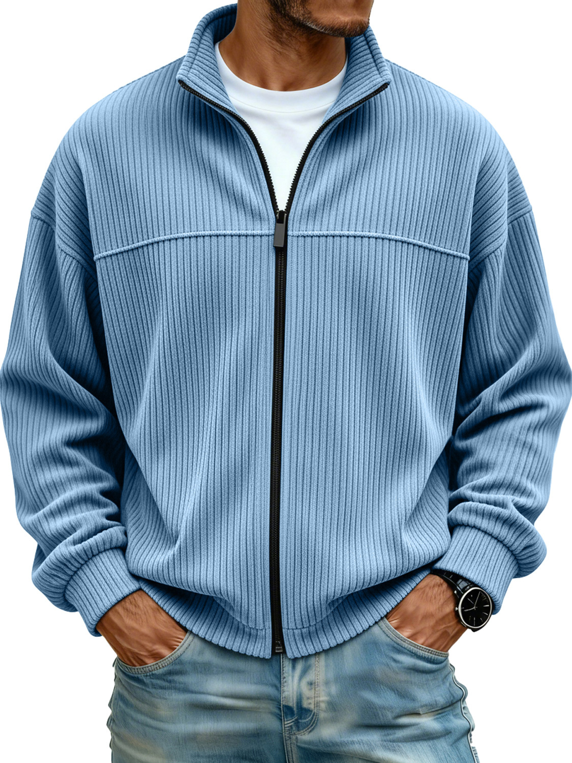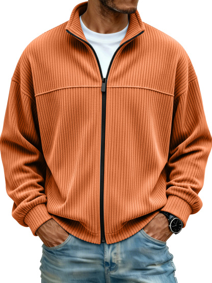 Men's Simple Stand Collar Ribbed Casual Loose-fitting Jacket